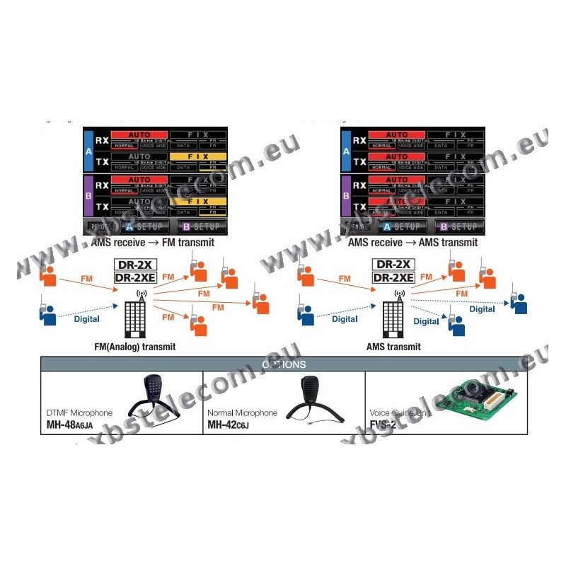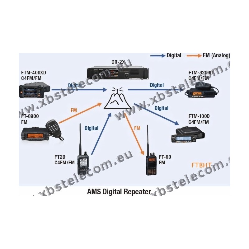 System Fusion enables interconnection between all users with different modes, This is made possible in System Fusion by AMS, The AMS function automatically recognizes the signal as a C4FM digital or a conventional FM signal, then the DR-2X retransmits the signal in the preset communication mode.