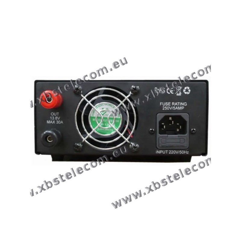 Alimentation stabilisée, 30A en pointe, avec tension réglable de 9 à 15 volts.