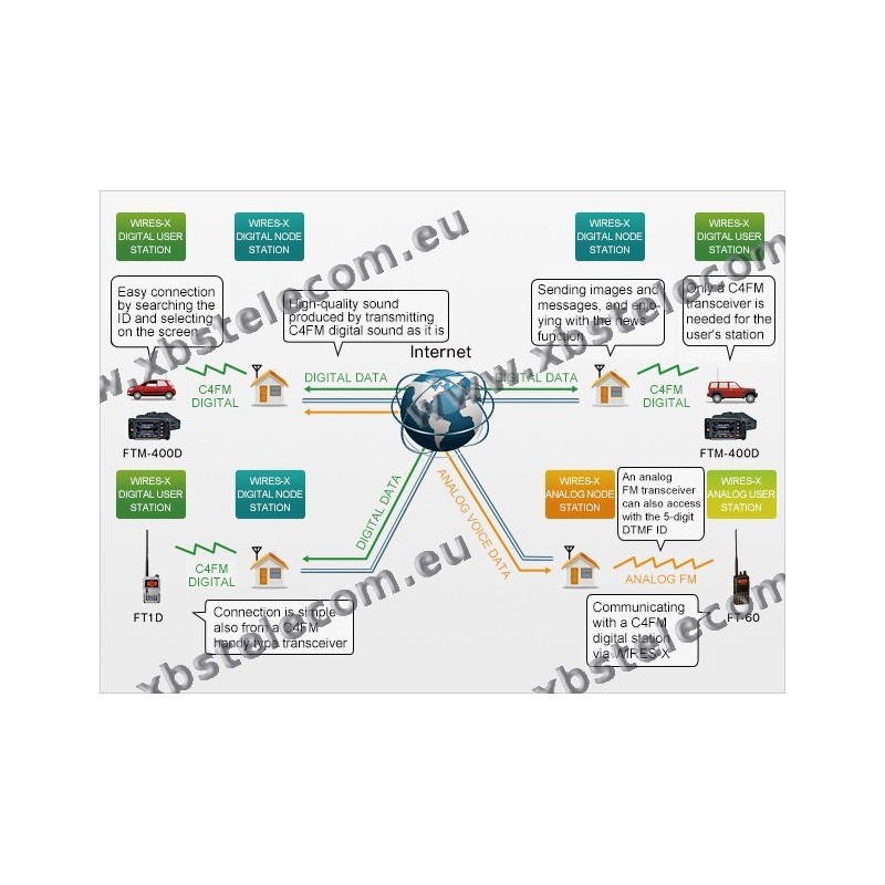 The WIRES-X HRI-200 Interface is small in size but packed with features, and everything you need to get started is included in the package, with no extra cables or components to buy.Digital/Analog Mutual communication WIRES-X of course also supports traditional analog FM users. Not only can analog FM stations have a QSO with each other, WIRES-X also permits C4FM digital stations to communicate with analog FM stations.Group Mode Functions Registering multiple user IDs as well as nodes and rooms to a unique group makes it easy to stay in touch with a circle of friends and affiliates. When operating within a group, keeping track of the in-range/out-of-range status of individual members is a snap. WIRES-X provides everything that is needed to maintain a node or room for use by members only.Store digital data, text and audio The News Station function allows on demand retrieval of stored data such as audio, images, and text.Preset Search Functions Preset Search allows the operator to easily search and connect to local node stations directly from the operators transceiver, providing a node directory at your fingertips.Simple and Easy Setup Establishing the connection between the HRI-200 and a computer is quick and simple, requiring only a single USB cable. Support for USB bus power means that an additional external power supply is not needed. Opening ports in the router also can be done simply by enabling the UPnP functions in the WIRES-X Software*. Working your way through complicated router settings is a thing of the past.Supplied Accessories USB CableSpecifications Supply Voltage: USB Bus Powered, DC +5.0 V ± 5 % (Negative Ground) |