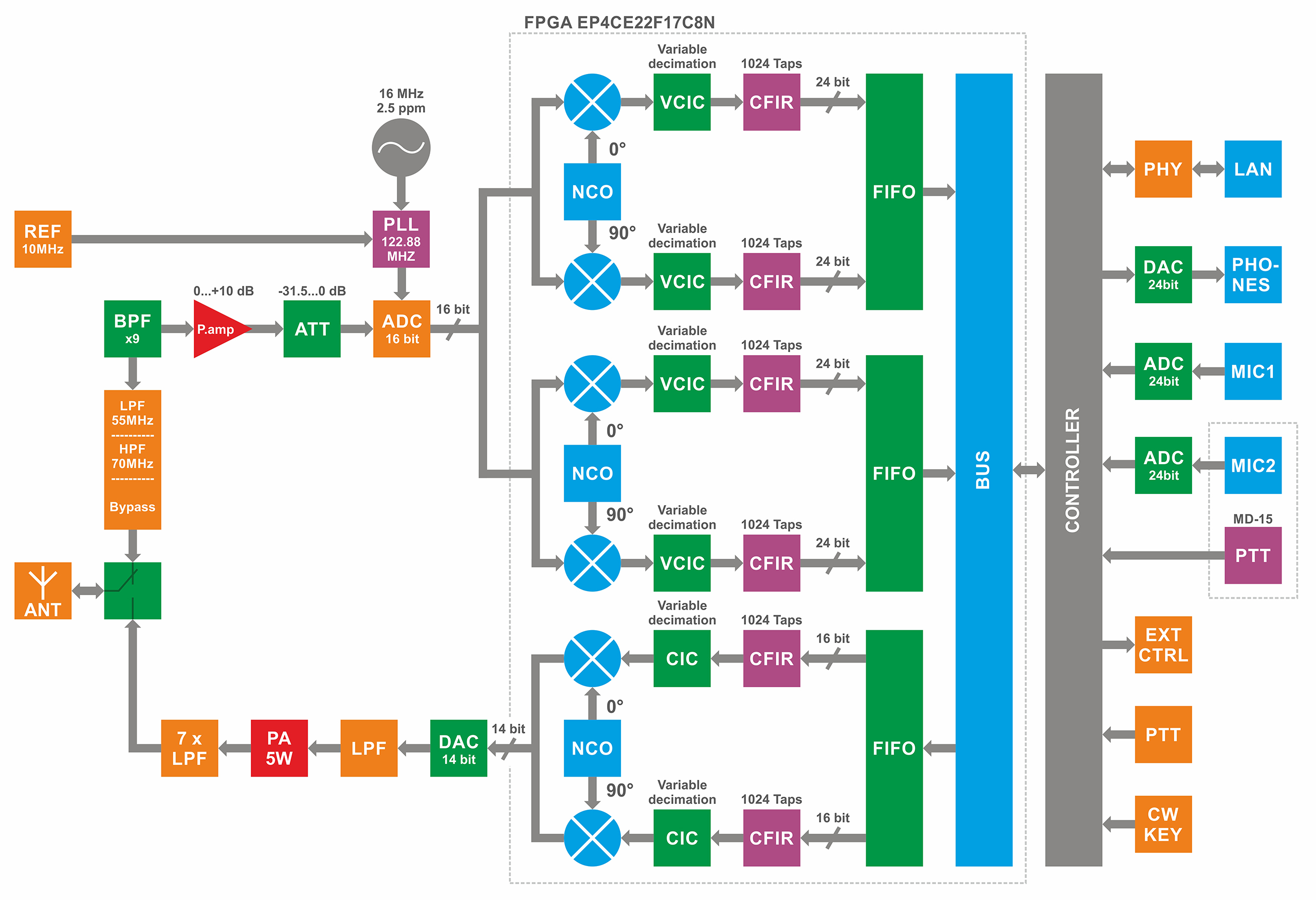 | Filtres RX HF, MHz | LPF: 58 + 8 x BPF |