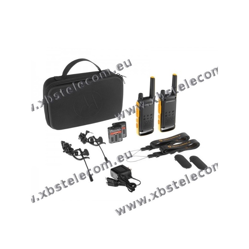 2 walkie-talkie, 2 clip per cintura, caricatore di rete con 2 prese micro USB, 2 batterie ricaricabili NiMH, 2 cordini, 2 auricolari, manuale di istruzioni, custodia per il trasporto, adesivi di personalizzazione (16 pezzi)